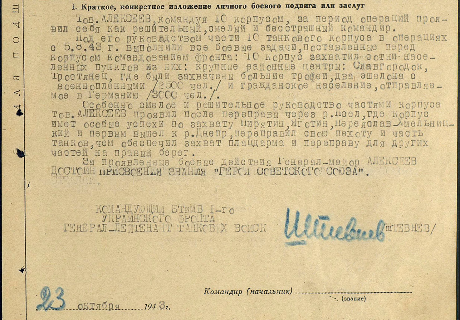 В Уманско-Ботошанской операции в марте-апреле 1944 г. корпус Алексеева наступал через Умань к Южному Бугу и вышел на реку Прут в районе румынского города Яссы.