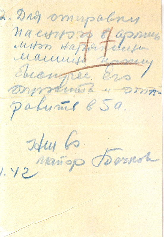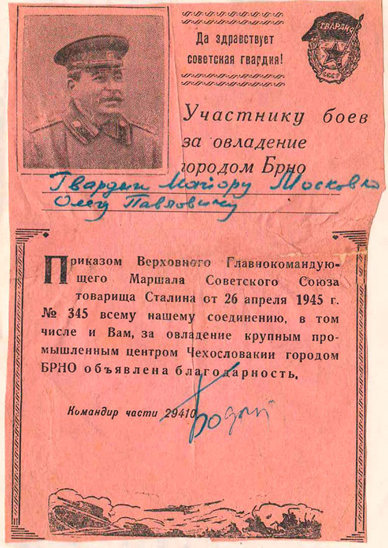 В этих боях тов. БОЧКОВ лично взял в плен румынского генерала ТЕОДОРЕСКУ. За правильную организацию операции по прорыву обороны противника на всю ее глубину, за умелое использование взаимодействия частей и спецподразделений дивизии гвардии полковник БОЧКОВ достоин правительственной награды – ордена «КРАСНОЕ ЗНАМЯ».