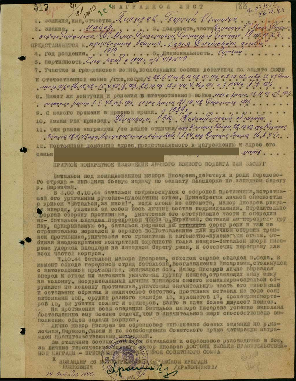 По итогам этих боев майор Г. И. Писарев приказом войскам 4 Украинского фронта № 179 от 01.06.44 г. был награжден орденом Отечественной войны II ст.