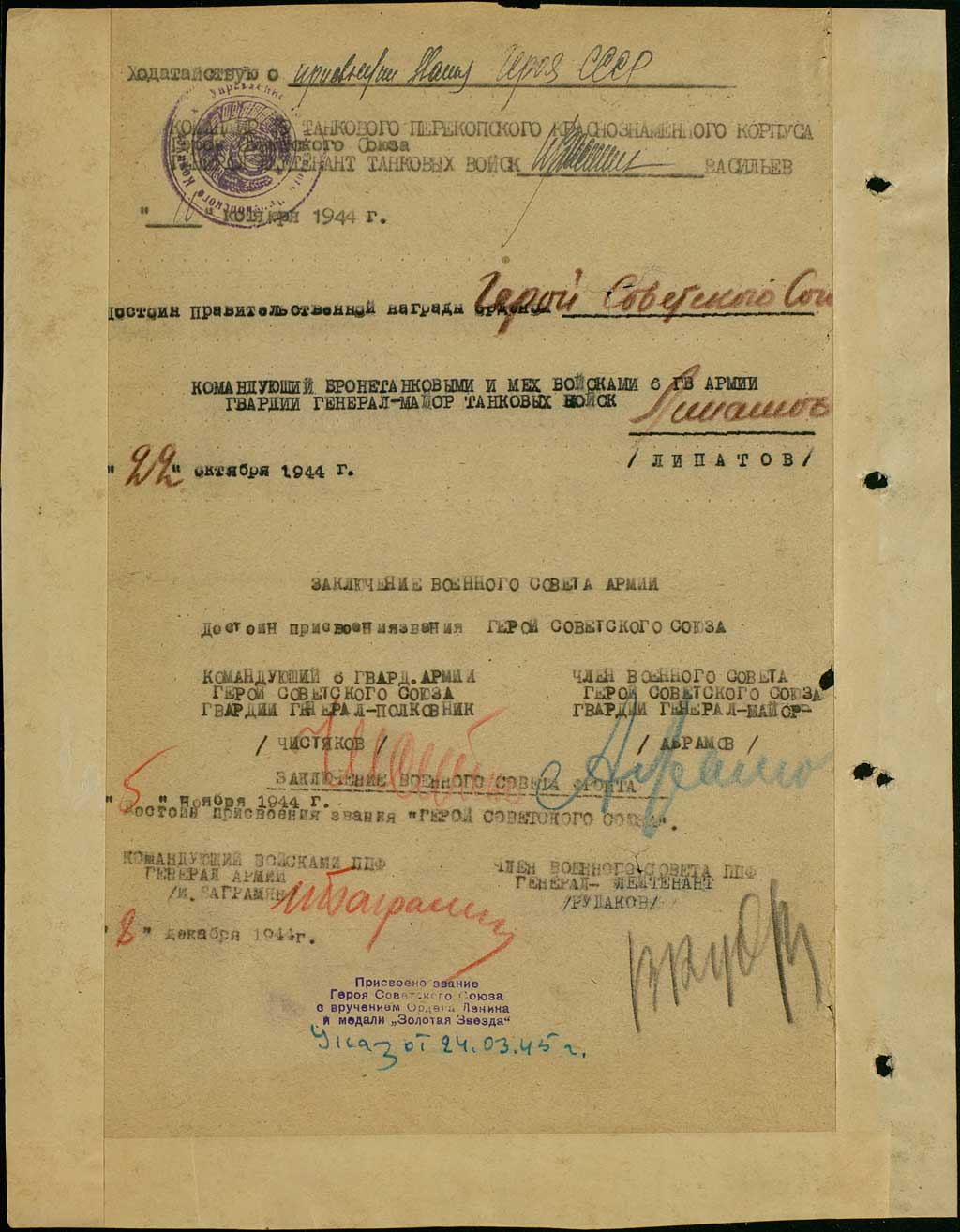 В период с 3.11 по 7.11.43 г., овладев Турецким валом левее шоссейной дороги и очистив его от противника, вступил в Крым в район колхоза им. Буденного. Неоднократно отражал атаки противника, прочно удерживая [...] рубеж.