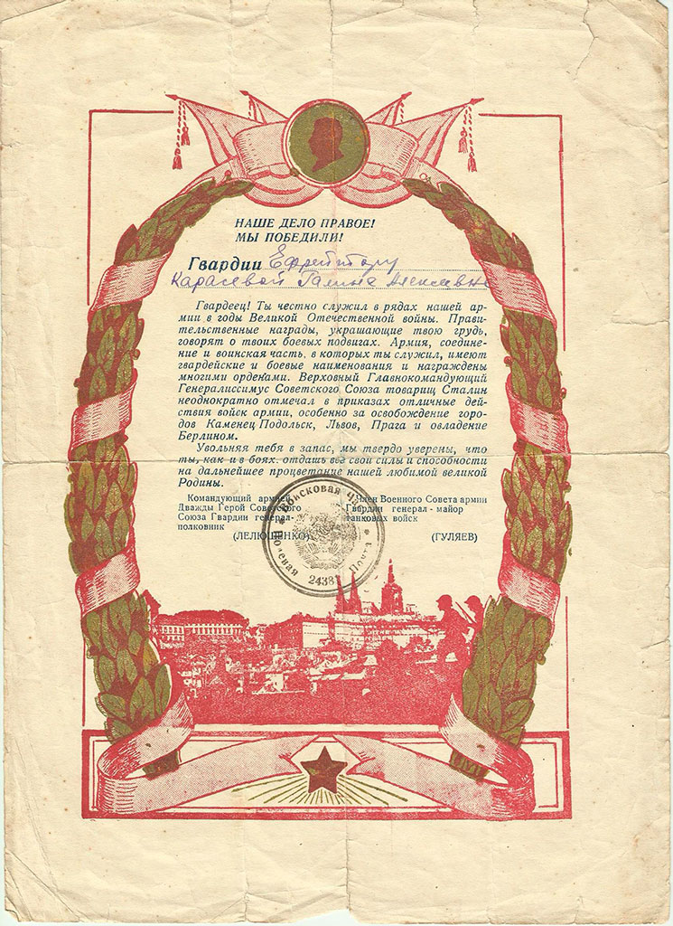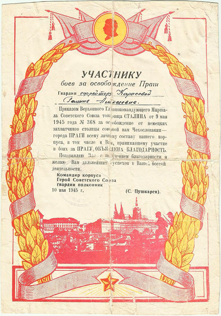 Приказом командира 424 гв. самоходно-артиллерийского полка № 03 от 15.05.1945 гв. сержант Г. А. Карасева была награждена второй медалью «За отвагу». Тогда же к боевым медалям добавилось несколько благодарностей от Верховного Главнокомандующего и командования 4 гв. танковой армии.